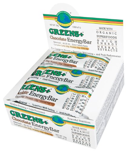 Box of 12 Chocolate GREENS+® Energy Bars.We've combined organically grown superfoods, soy protein, high energy herbal extracts and a little bit of honey to produce the only cold-processed, alkaline-forming green food bar. The GREENS+® Energy Bar contains no processed sugar, salt, corn syrup, hydrogenated oil, synthetic sweeteners, preservatives, or genetically modified foods of any kind. Available in natural and chocolate-coated flavors. If you're hungry and short on time, grab a nutrient-rich GREENS+® Energy Bar NOW!You will not be disappointed with